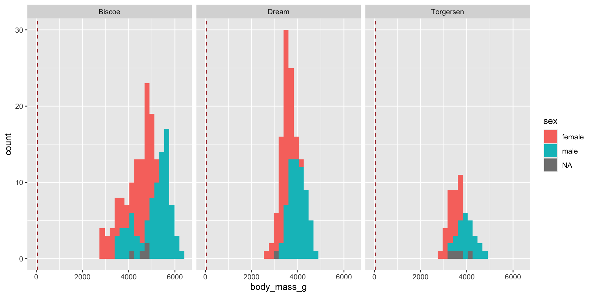 Add a vertical line at the mean() value, fill by sex and facet by island.