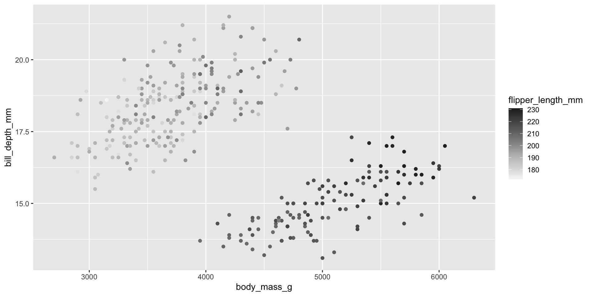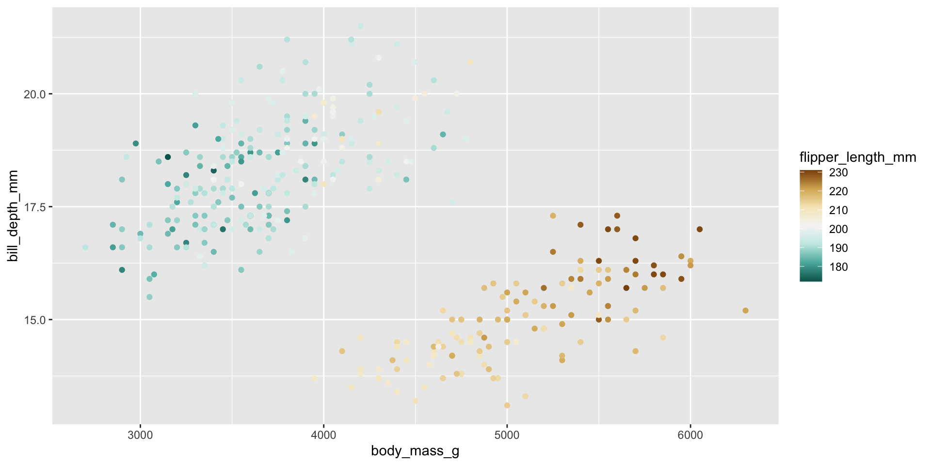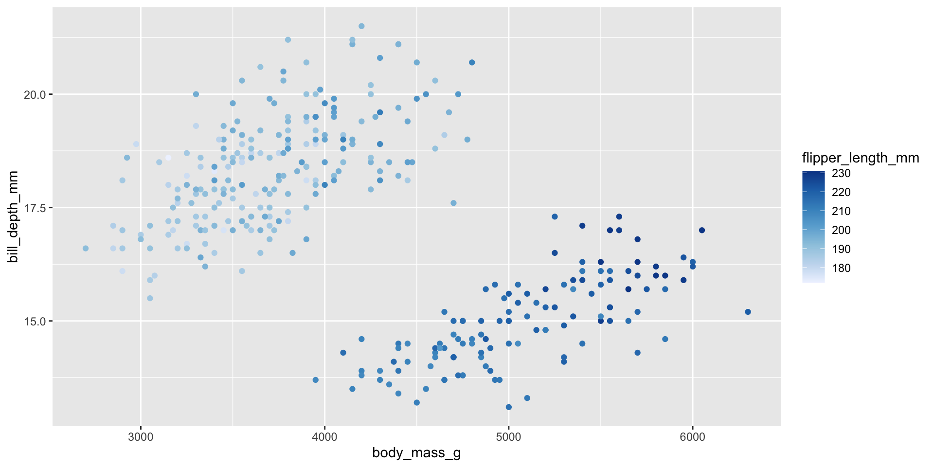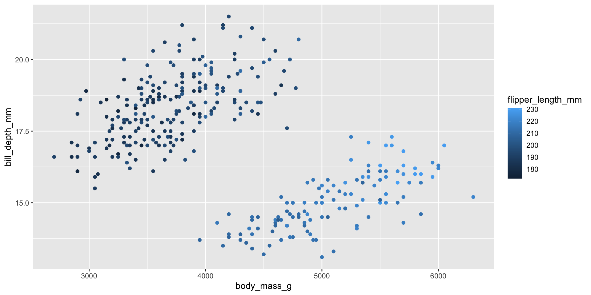 I’d like to show the flipper length as a third variable. flipper_length_mm is a continuous and numeric variable. We can color by it.