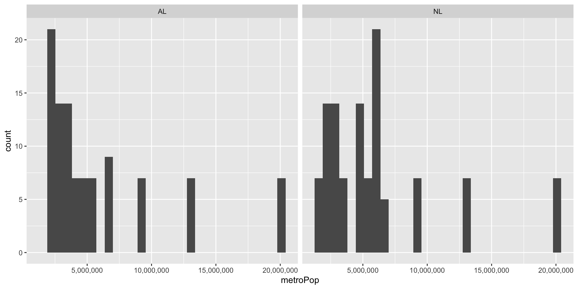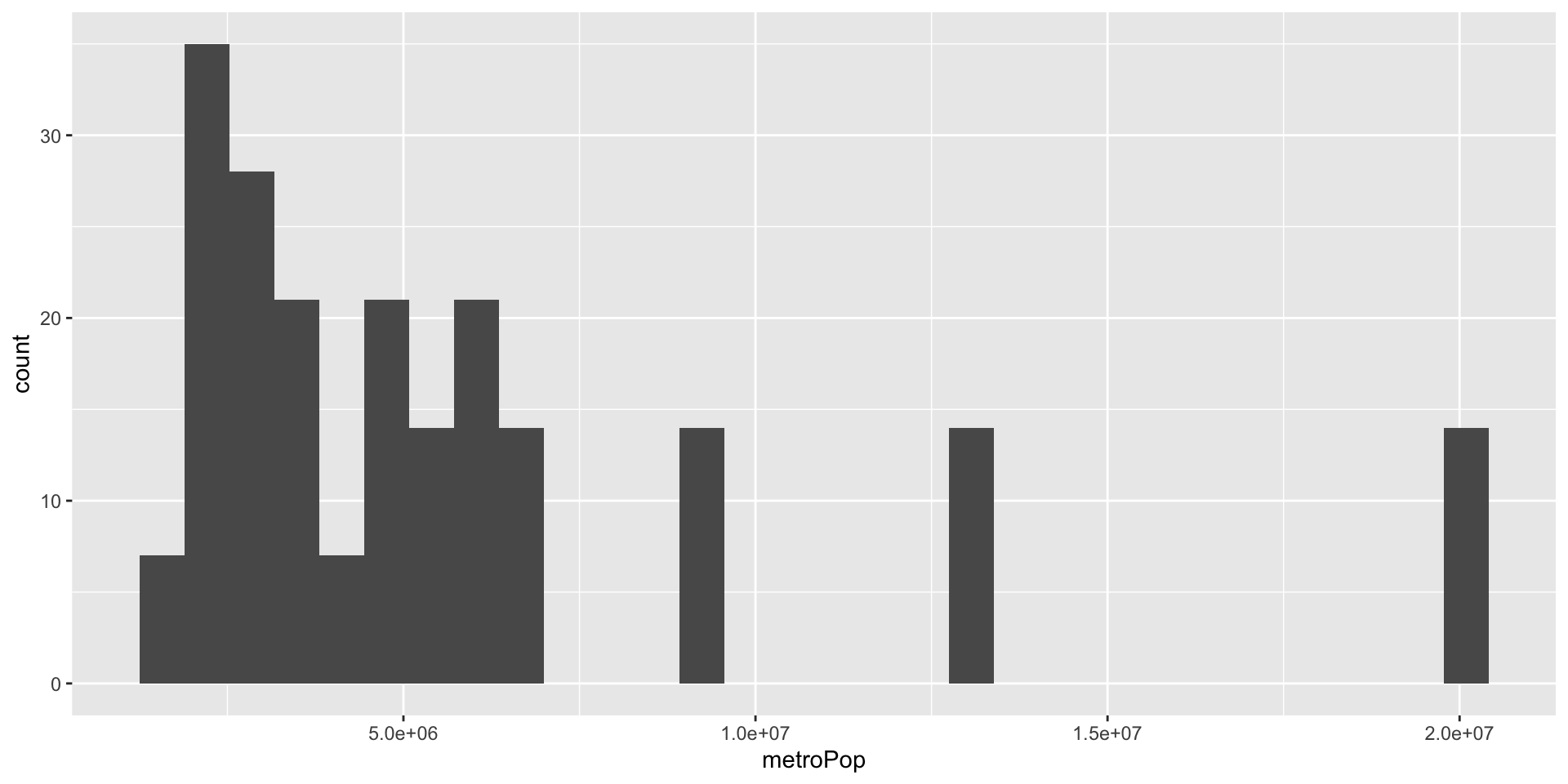 Note that metroPop is a numeric variable, and should be graphed with a histogram.