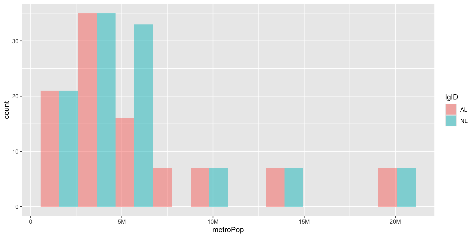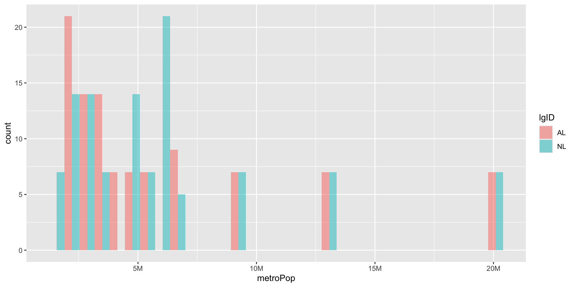 By default R stacks our plots ( and pick gross colors) This make the American League look taller than the National League. We should dodge them instead by setting the position parameter.