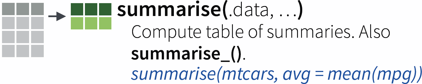 summarize(): collapse into a single rowgroup_by(): group by a variabletake a vector